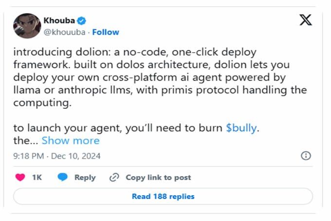 除了这笔付款,开发者Khouba最近透露了他们的一项雄心勃勃的新项目——Dolion,一个无需编码的平台,用户可以通过一键部署自己的跨平台AI代理。为了与Dolion互动,用户必须销毁BULLYToken,这为Token创造了购买压力,积极地减少了Token的供应量。