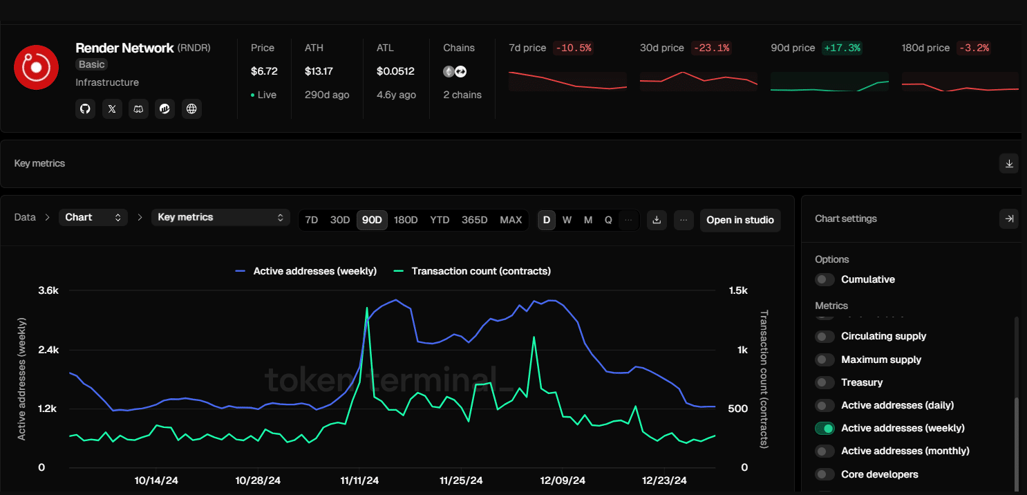 TokenTerminal 的数据显示,Render 网络的活跃度显著下降。在 2024 年 12 月下降 50% 之后,该网络的每周活跃地址数量正接近两个月来的最低点。