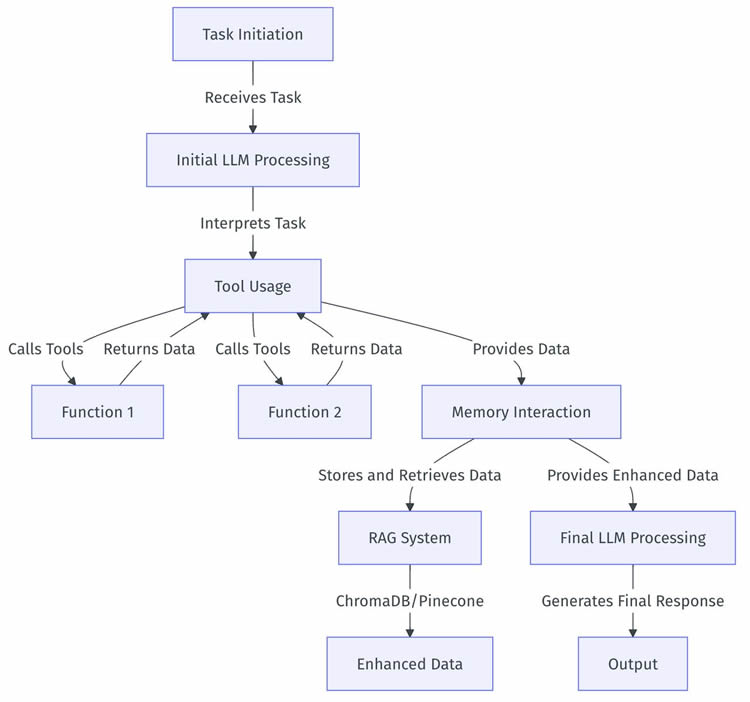 代理的工作流可以分为几个阶段:任务启动、初步LLM处理、工具使用、内存交互和最终LLM处理。