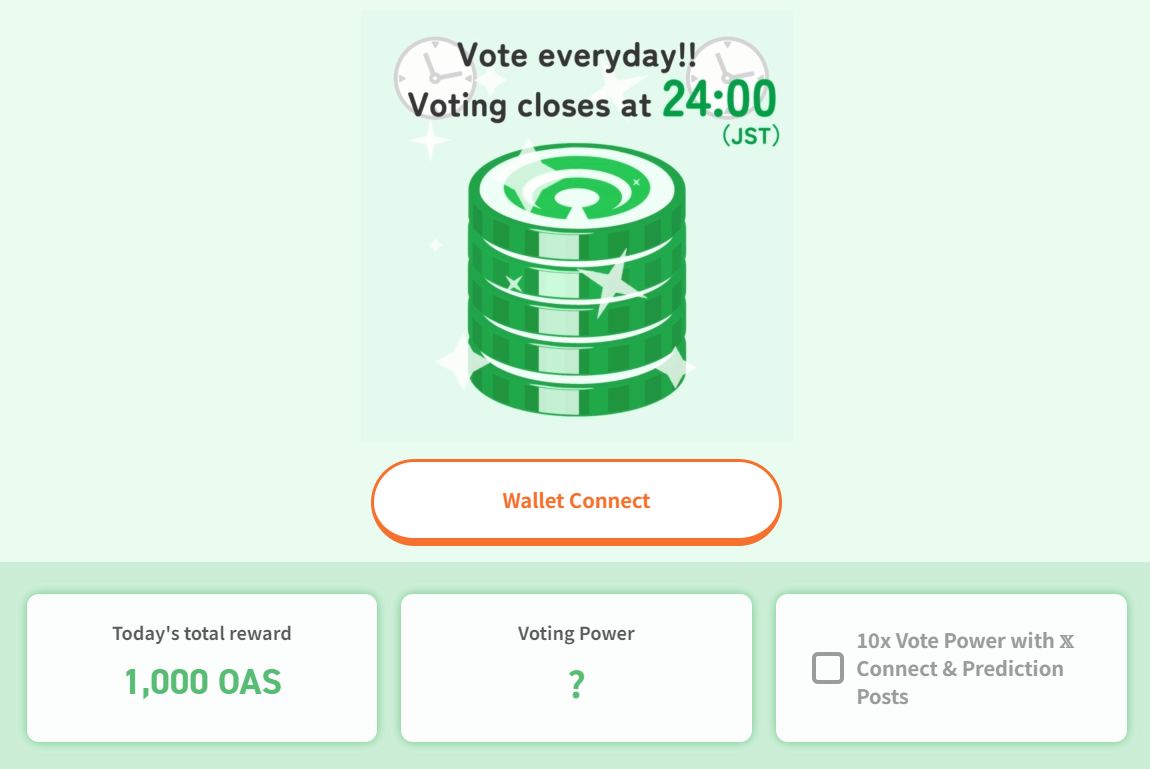 一种游戏,您可以通过猜测价格会走向来赚取 OAS 代币。如果你在 Twitter (X) 上转发结果,那么声音的强度就会增加 10 倍。因此,如果你猜,利润将增加 10 倍,如果你做出不成功的选择,损失将增加 10 倍。