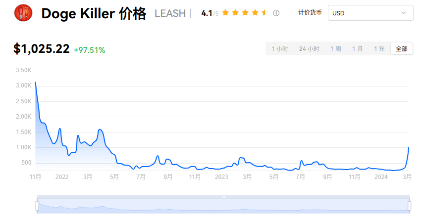 24 小时最低/最高价 24 小时最低 $501.16 最新价格 $1,025.22 24 小时最高 $1,638.99 热度排行 21 市值排行 196 市值 $1.11亿 添加自选人数 (百分比) 0.46% 历史最高价 $3,988.00 -74.30% (-$2,962.78) 2021年11月5日 (3 年前) 历史最低价 $238.80 329.31% ( $786.42) 2023年6月10日 (10 月前) 首次发行时间 2021/04/16 首次发行价 $0.00 流通总量 10.76万 LEASH 流通市值 $1.11亿总结: