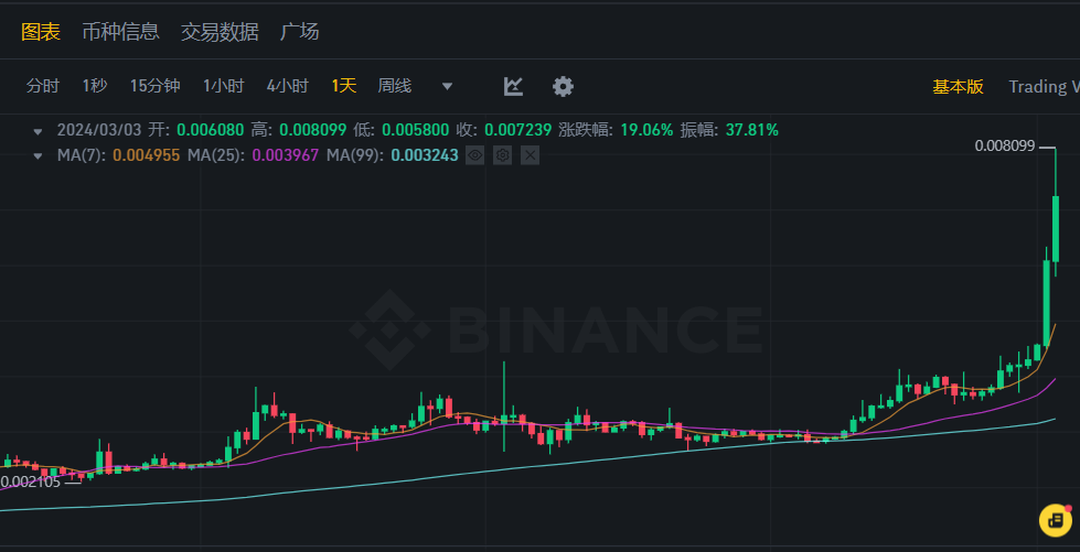 PANews 3月3日消息,据币安行情显示,24小时涨幅排名靠前的几个代币为:SLP现报0.007721美元,24小时涨幅为66.9%;QUICK现报0.10346美元,24小时涨幅为57.41%;SYS现报0.274美元,24小时涨幅为44.69%;FLOKI现报0.000134美元,24小时涨幅为41.61%;VANRY现报0.14美元,24小时涨幅为35.72%。