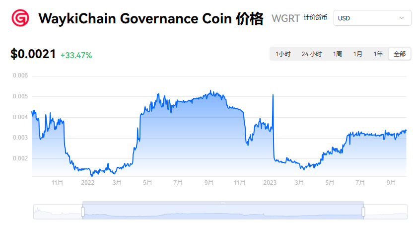 WaykiChain Governance Coin 当前价格为 $0.0021。WaykiChain Governance Coin 的价格在过去 24 小时内上涨了 33.47%。目前,WaykiChain Governance Coin 市值排名为第 -- 名,实时市值为 $0.00,流通供应量为 0.00 WGRT,最大供应量为 210.00亿 WGRT。我们会实时更新 WaykiChain Governance Coin/USD 的价格。WaykiChain Governance Coin 价格表现 (美元)