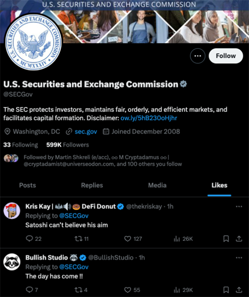 进一步增加了黑客攻击的可能性的是,美国证券交易委员会官方账户的“喜欢”部分显示,在发布虚假公告的同时,该页面与两个与加密货币相关的账户进行了互动。