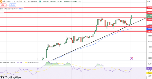 比特币突破4.5万美元关口,预计ETF批准在即