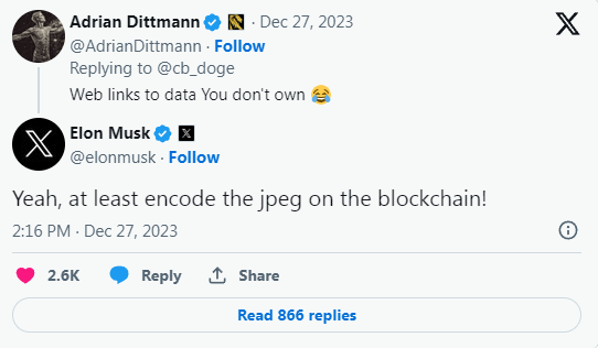 埃隆·马斯克再次分享了他对当前不可替代代币(NFT)结构的看法,指出将JPEG图像嵌入区块链可以为爱好者建立独家所有权。12月27日,马斯克在他的平台X(前推特)上回应了一条评论,狗设计师质疑质疑“是否还有人记得NFT”这引发了阿德里安·迪特曼的有趣抨击,他幽默地将NFT比作“通向你并不真正拥有的数据的网络链接”这位科技大亨迅速反驳道,强调了在区块链上编码JPEG的重要性。