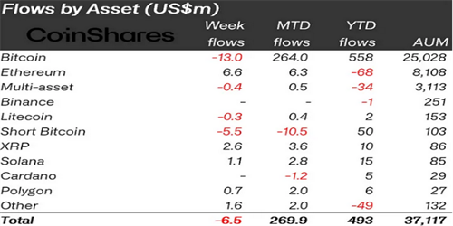 Coinshares 分析师 James Butterfill 表示,过去一周,比特币相关基金流出 1300 万美元,扭转了五周的看涨流入趋势。