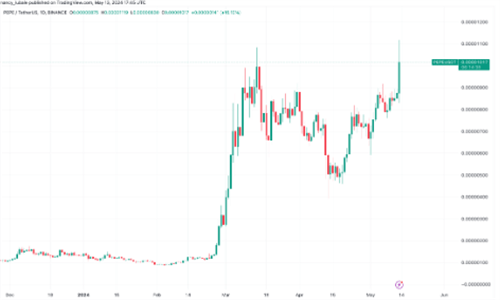 截止至5月14日,随着著名GameStop交易员“Roaring Kitty”(真名基思·吉尔)在社交媒体平台的回归,模因币市场迎来了一波强势上涨。其中,佩佩币(PEPE)表现尤为抢眼,价格自3月15日以来首次突破0.000010美元水平,创下历史新高。