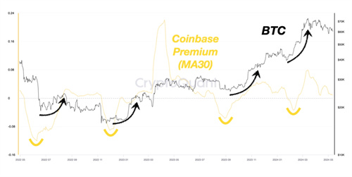 现在,这张图表显示了过去几年比特币Coinbase溢价的30天移动平均线(MA)的趋势: