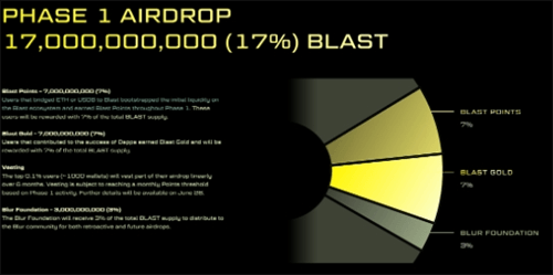 根据公告,此次空投的代币分配将遵循以下规则:7%的代币将分配给那些将以太币或美元Blast (USDB)桥接到网络的用户;另有7%将奖励给那些为Blast上的去中心化应用程序(DApps)成功做出贡献的人士;剩余的3%将划拨给Blur基金会,用于未来对其社区进行进一步的空投活动。