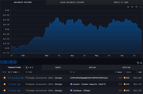 值得注意的是,“139Po”钱包并非首次与德国政府进行交易。仅在几天前,即6月20日和19日,该政府钱包就分别向“139Po”转移了800枚和500枚比特币。这一系列频繁的转账活动引发了市场的广泛关注。