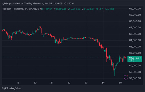 6月26日最新消息报道,随着第二季度的最后一周开始,比特币(BTC)的价格急剧下跌。周一,这一旗舰加密货币的大幅下跌使其暂时失去了6万美元上方的支撑。