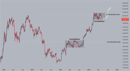 如果发生这种情况,比特币将在突破新的关键阻力位(74,000美元的ATH价格)之前经历一个“剁手的夏天”。根据Jelle的说法,这次突破可能会花费BTC 10万美元。