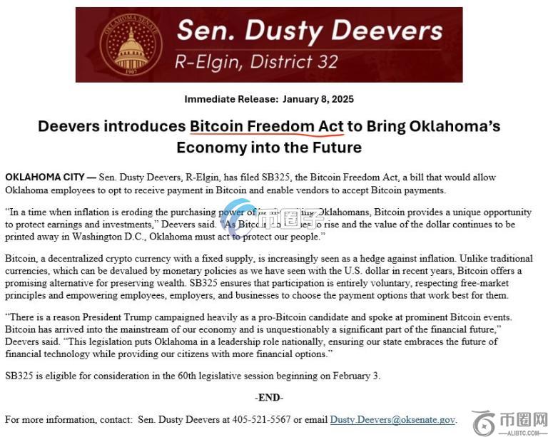 火必huobiex官网(Alibtc.com)讯:美国俄克拉何马州参议员Dusty Deevers近日提交了《比特币自由法案(Bitcoin Freedom Act)》,让当地居民及员工能选择以比特币支付薪水,并推动商家接受比特币支付。
