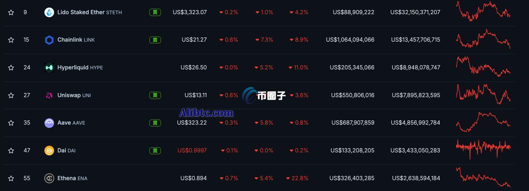 CoinGecko数据显示,其整体市值近24小时小跌0.7%,但主要的几个代币出现较大跌幅,包括-7.3%的Chainlink、-6.8%的CurveDao、-4.9%的Hyperliquid、5.7%的Aave、-5.4%的Ethena、-2.9%的Uniswap等。
