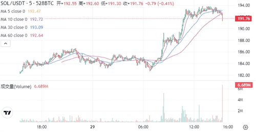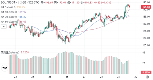 据当前的最新数据显示,sol币的当前最新价格为:$ 192.05,在当前的24小时内价格上涨: 3.87%,约美元价格上涨: $7.17,24小时最高价格为:$193.90,24小时最低价格为:$182.63。