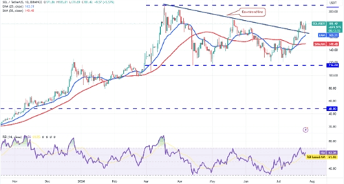 sol币在7月25日成功从下降趋势线反弹,这一迹象表明多头力量正在试图将该水平转变为支撑位。这一动作不仅显示了市场的反弹意愿,也预示着短期内sol币可能迎来一波向上的行情。