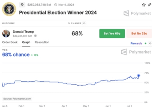 此次事件不仅加深了公众对政治安全的忧虑,也意外地搅动了加密货币市场。在以太坊预测市场Polymarket上,投机者迅速调整预期,特朗普在即将来临的大选中获胜的预测概率从60%猛增至68%,而拜登的连任概率则从30%大幅下滑至15%。特朗普目前在预测市场上占据显著优势,总体胜选率高达70%,远超拜登的15%和副总统卡马拉·哈里斯的9%。