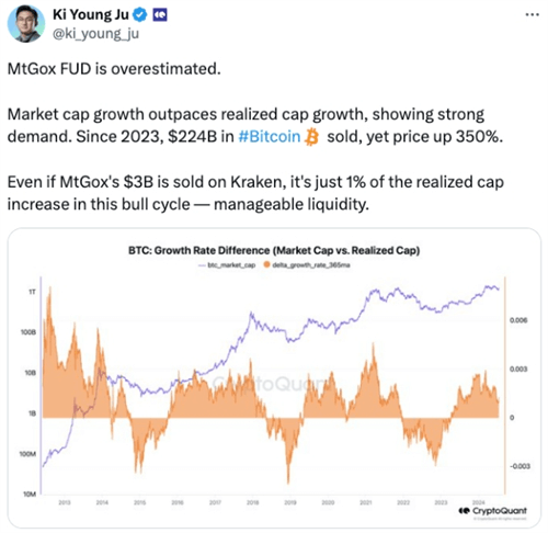 7月17日消息报道,知名链上分析平台CryptoQuant的创始人兼首席执行官Ki Young-Ju在社交媒体上发表了一系列观点,旨在平息市场对于Mt.Gox交易所还款对比特币(BTC)价格影响的过度担忧。朱表示,尽管Mt.Gox的还款计划引发了市场的广泛关注,但其对比特币整体市场的影响实际上被显著高估。
