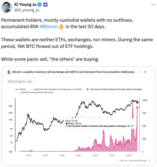 他提到,根据7月10日的数据,大型个人保管钱包(即“永久持有人”)在之前的30天内已经积累了85000 BTC,显示出市场中的长期投资者对比特币前景的乐观态度。