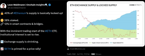 Bitwise首席投资官Matt Hougan预测,以太坊现货ETF在上市后的前18个月内可能吸引高达150亿美元的资金流入。即便这一预测值减半,分析师也认为以太币价格将受益于大量被锁定在质押和去中心化应用程序(DApp)中的供应。据Onchain分析师Leon Waidmann指出,以太币目前约有40%的供应被锁定,同时交易所的以太币存款在过去一个月内从1334万枚减少至1221万枚,这表明市场抛售压力有所减轻。