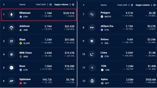 与此同时,以太坊的第二层解决方案在过去一个月内表现出色,吸引了寻求更低交易费用的投资者。Arbitrum、Blast和Base等二层网络的交易额大幅增长,而竞争对手如BNB Chain和Solana则出现下滑。