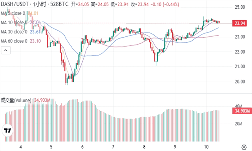 2024年7月4日,Dash币开盘价为24.1497美元,随后在交易日内持续走高,最高触及25.072美元。尽管期间有所回调,最低价仍保持在23.6243美元的高位。最终,收盘价定格在23.7772美元,全天交易额为3315.93万美元,市值则进一步增长至2.72亿美元。