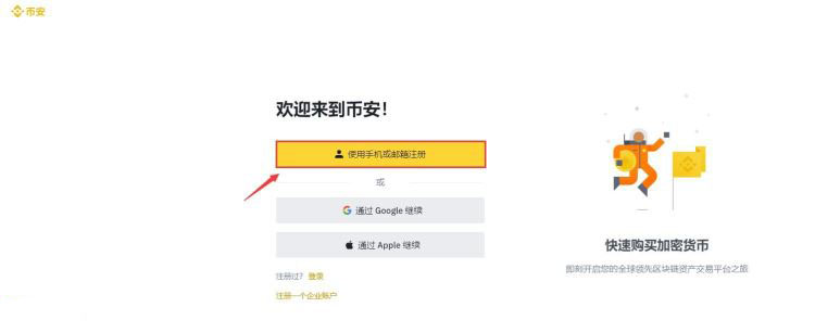 1.登录币安官网,点击【使用手机号或邮箱注册】,进入注册页面