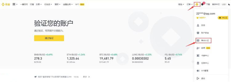 4.登录币安账户,在首页【用户中心】--【身份认证】进行身份认证,在该页面可以查看当前认证级别,它决定了您的账户在币安的交易限额。如需提升额度,请依次完成各个级别的身份认证。