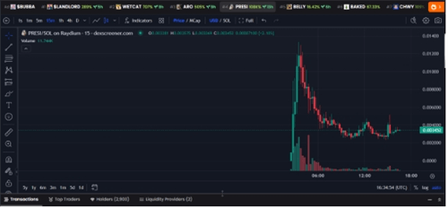 然而,好景不长,PRESI代币的市场表现迅速从高潮跌入低谷。据加密货币图表平台DEXScreener数据显示,代币在发布后的前75分钟内,价格从0.000045 SOL(约合0.0067美元)飙升至0.01 SOL(1.48美元),但随后即暴跌超过50%,回落至0.0042 SOL(0.62美元)。这一剧烈波动引起了链上侦探ZachXBT的注意,他通过深入分析区块链数据,揭露了背后的真相。