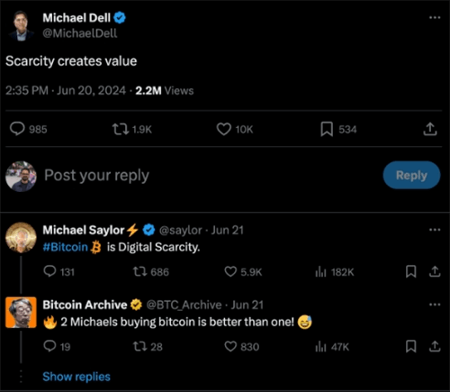 戴尔在推特上发表了一句“稀缺创造价值”的言论,这一观点经常与比特币相联系,因为比特币的总量被限制在2100万个,而其市场需求持续上升。此条推文迅速吸引了比特币企业财务资产的知名倡导者迈克尔·塞勒的注意。戴尔随后转发了塞勒的评论,并附上一张趣味的图片,图中一个饼干怪兽正在“吃”比特币,这一举动无疑增加了市场对于戴尔可能投资加密货币的期待。
