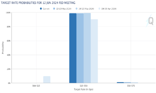 此外,市场似乎并未对美联储可能的政策放松给予太多关注。根据CME集团的预测工具,市场认为在九月份之前发生加息的可能性依然存在,但美联储即将于6月12日召开的会议上突然削减的可能性仅为1.1%。