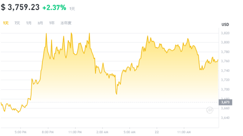 今日,以太坊的实时价格攀升至3,759.23(ETH/USD),其当前市值也随之跃升至451.59B USD。在过去的24小时里,尽管成交量稍降,但依然达到了$33.43B USD,市场活跃度不减。