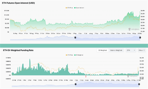 以太坊价格的攀升与其未平仓合约(OI)和融资利率的显著上升紧密相连。截至5月21日,以太坊期货的未平仓合约规模激增超过30亿美元,达到146.8亿美元的新高,同时资金费率也攀升至每周0.567%的一个月高点。