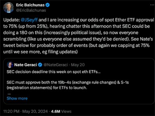 彭博的ETF分析师Eric Balchunas和研究分析师James Seyffart在得知此消息后,将现货以太币ETF的获批几率从原先的25%上调至75%。