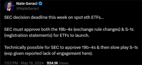 彭博高级分析师Eric Balchunas透露,听闻SEC计划在上午10点前返还修订后的现货以太坊ETF的19b-4文件,这可能意味着最快在本周三就能获得批准。以太坊市场有望迎来新的里程碑。