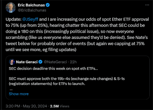 5月20日,以太坊价格飙升至3685美元,此前彭博社高级分析师Eric Balchunas将以太坊ETF的批准几率从25%上调至75%。Balchunas指出,美国证券交易委员会(SEC)可能面临外部政治压力,因其之前与ETF申请人的沟通较少。此外,有报道称SEC正要求各大交易所更新备案文件,尽管监管机构尚未正式确认此消息。