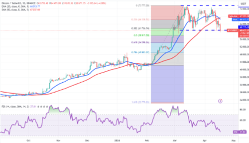 4月17日,北极熊试图压低比特币的支撑价位至60,775美元以下,并构建了一个双层模式。假如他们的尝试成功,BTC/UDS汇率可能会开始下滑,先降至50%的斐波那契回调水平,即58,017美元,然后进一步下跌到61.8%的回调水平,也就是54,298美元。