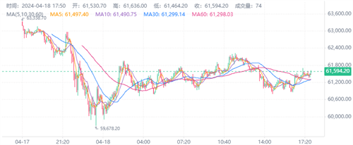 截止2024.4.18,比特币最新价格为$ 61,587.00美元,24小时最高价为$63361.114美元,24小时最低价为$59918.255美元,24小时跌幅-2.15%;