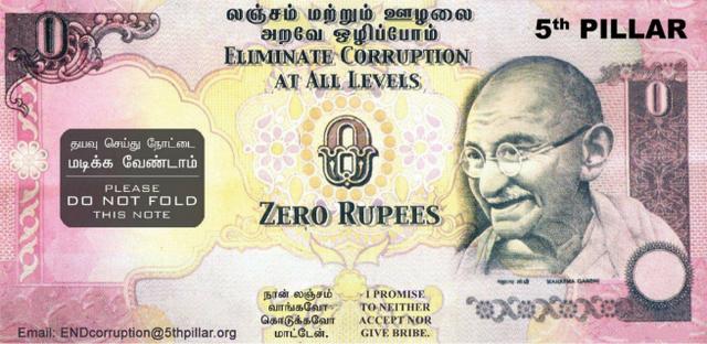 为了表达对于印度政府官员腐败的不满,一家叫做第五支柱的当地非政府组织印刷了一些“纸币”,这些纸币的模样几乎和官方发行的50卢比货币一模一样,只是面值为0。