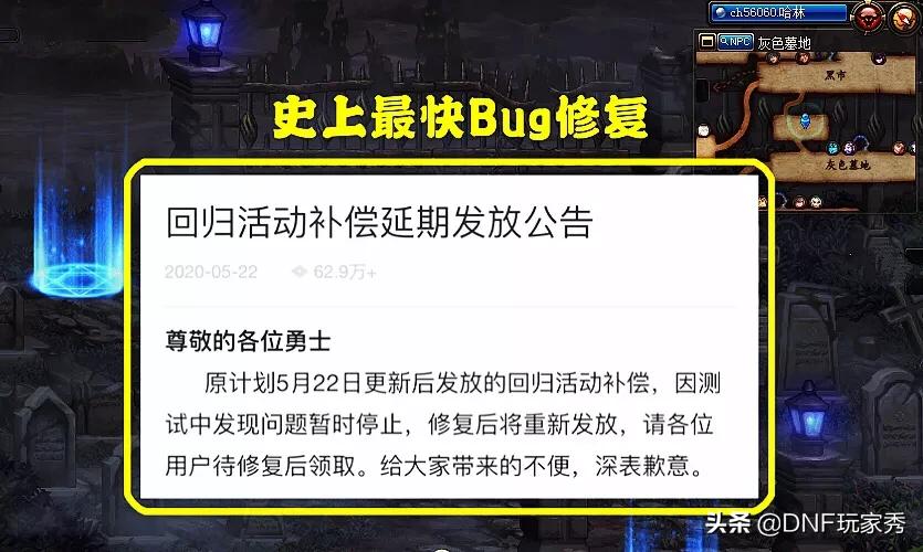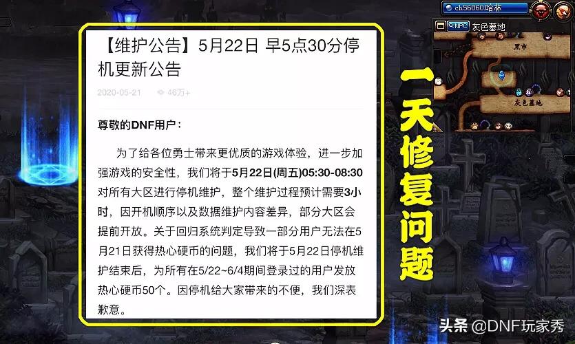 非常明显,这是回归系统出了Bug所致,把春节版本回归的玩家,100级版本回归的玩家,统统定义为了回归玩家,以致于组队打团,一眼望去全是100级史诗加身的回归玩家!很多玩家立即反馈,这一次官方的反应神速,立即在官网发布公告,将于第二天5:30分停机维护,修复回归玩家错误的Bug,并且对所有玩家补偿50个热心硬币。有勇士调侃,这是DNF史上第一次补偿啊,爱了。