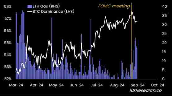 然而,在9月FOMC会议后,比特币的主导地位下降。上周的FOMC会议之后发生了一个显著的变化:比特币的主导地位已经减弱,而以太币的Gas费则因整个生态系统中的山寨币活动激增推动下飙升。如果联准会仍然对降息持开放态度,那么山寨币可能会获得进一步的动力。