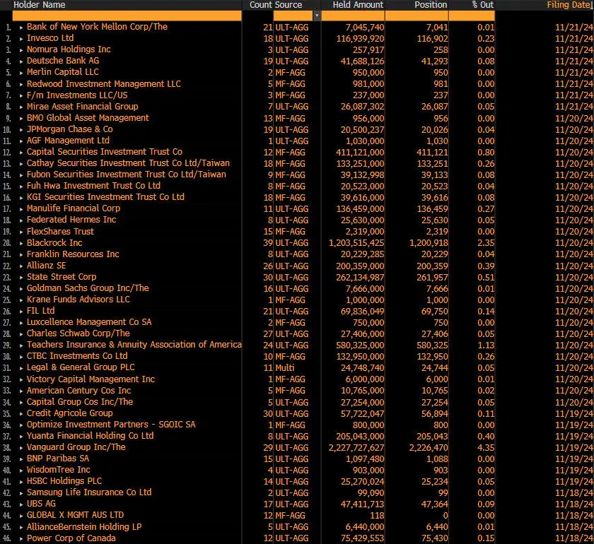 其中,据@thepfund分享的最新数据,自11月18日以来,MicroStrategy的主要债权持有人(有权选择将债券转换为股票)名单显示,先锋集团位居榜首,贝莱德位列第二,如高盛、摩根大通及德意志银行等多家知名金融机构和投资公司也出现在名单中。