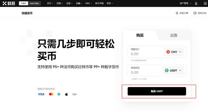 以USDT为例:【买币】—【快捷买卖】—填写购买金额—选择【支付方式】—【购买USDT】。