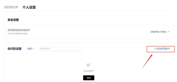 左上角点击【买币】—右上角【更多】—【个人设置】—【添加收款账户】,按要求完成操作。