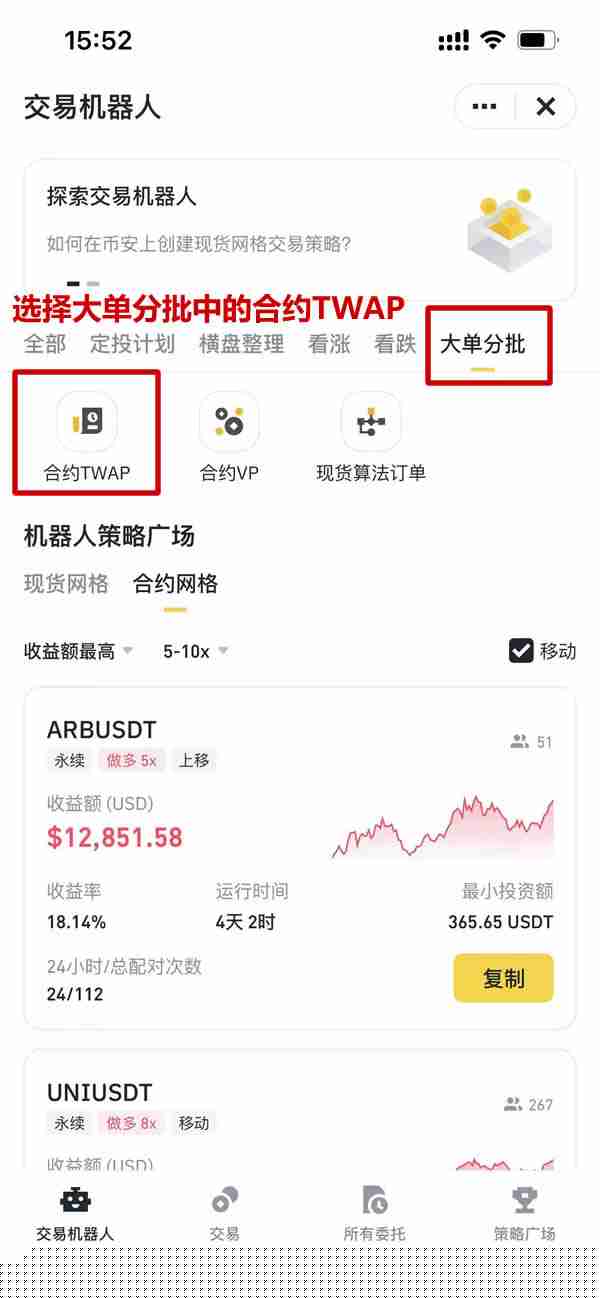 - 步骤三:点选「大单分批」中的「合约TWAP」