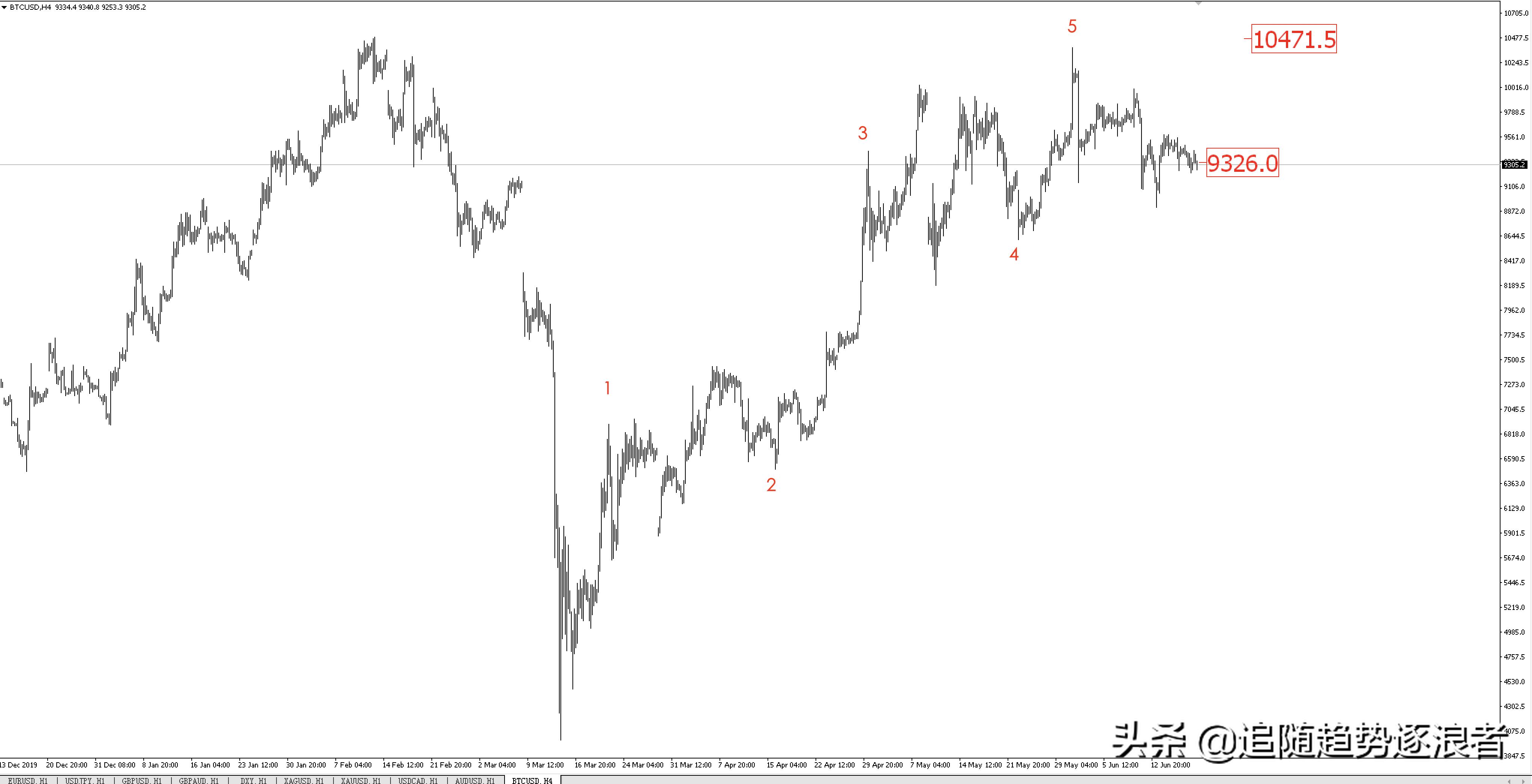 比特币6月2日平台时间0:00前一轮上涨冲击前高未果,便终结了此波段的上行趋势。单从图表中价格运动来讲,这一轮的上行趋势只是价格内在规律的体现——即完成一个同级别的趋势结构而已。下一周如果价格运行落在图中下方红色点位之下,空头交易头寸介入; 反之,多头交易头寸介入。